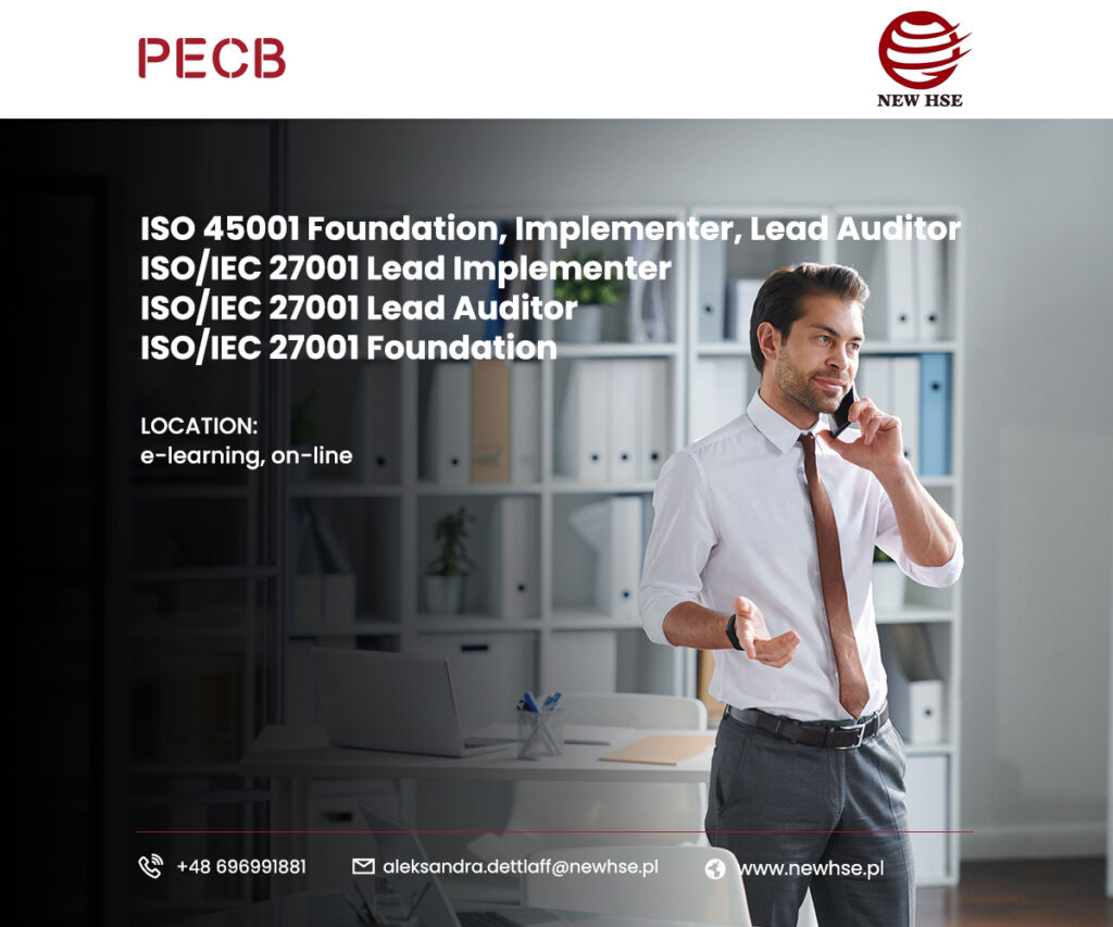 NEW HSE has joined the ranks of Approved Partners of PECB. Thanks to this, you can benefit from training such as: ISO 45001 Foundation, Implementer, Lead Auditor; ISO/IEC 27001 Lead Implementer; ISO/IEC 27001 Lead Auditor, and ISO/IEC 27001 Foundation.